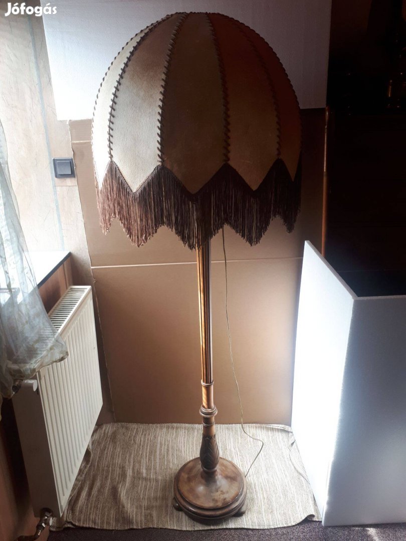 Eladó egy db XIX. sz.-i fa testű faragott mintás 3 izzós (E27)Állólámpa. Egyenként kapcsolható foglalatokkal. Szarvasbőr ernyővel a képeken látható állapotban. Az ernyő egy mozdulattal levehető. Korának megfelelő állapotban 175 cm magas és az ernyő 60cm átmérővel bír. Mindene működik kipróbálható Érden és átvehető, nem postázom. Előre senkinek pénzt nem küldök.