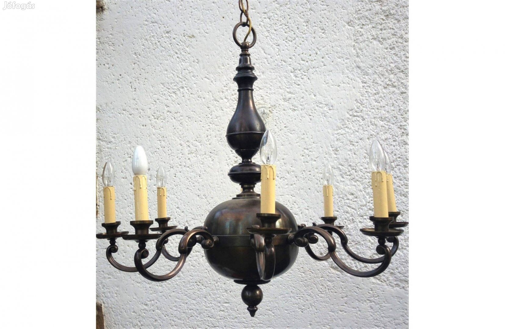 Nyolc karú angol barokk bronz csillár, szélessége 84 cm, magassága 80 cm + a lánc és a mennyezetrózsa.
