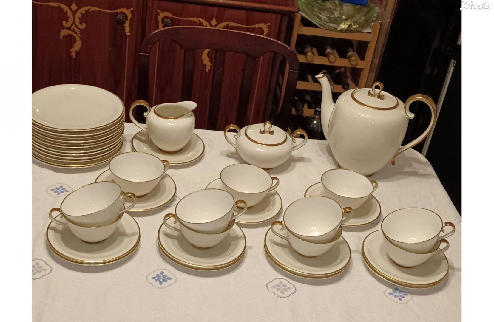 Németországban készült, tiszta fehér, finom bajor porcelán készlet, aranyozott szélekkel és fülekkel.