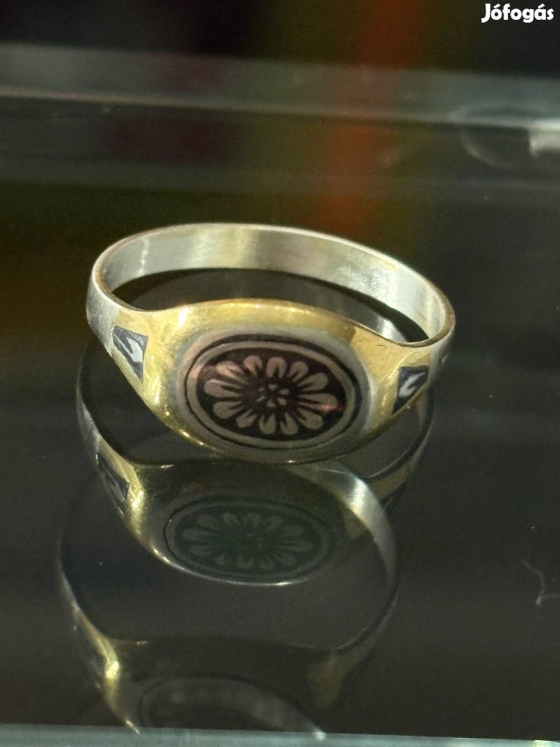 Eladó egy különleges, hihetetlen mutatós, látványos, mégis kecses, két színű antik ezüst gyűrű, részben arányozva.