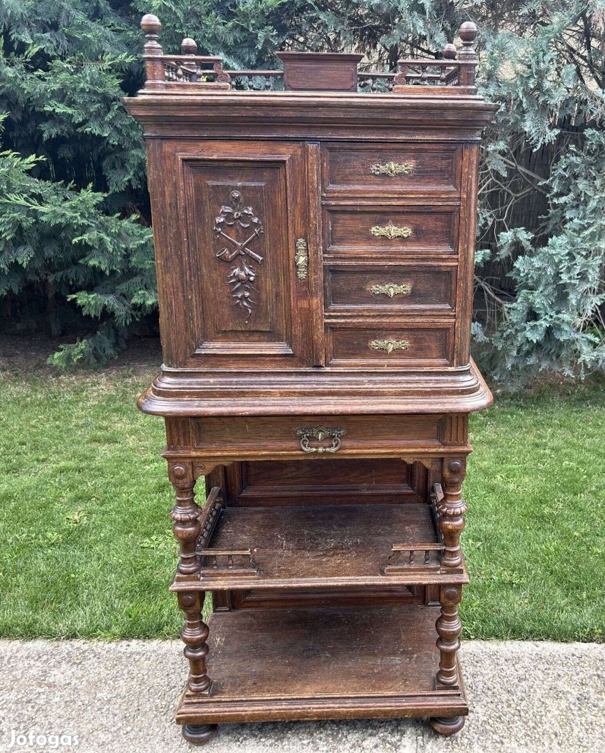 Antik faragott pipatároló fiókos polcos kisszekrény komód szekreter