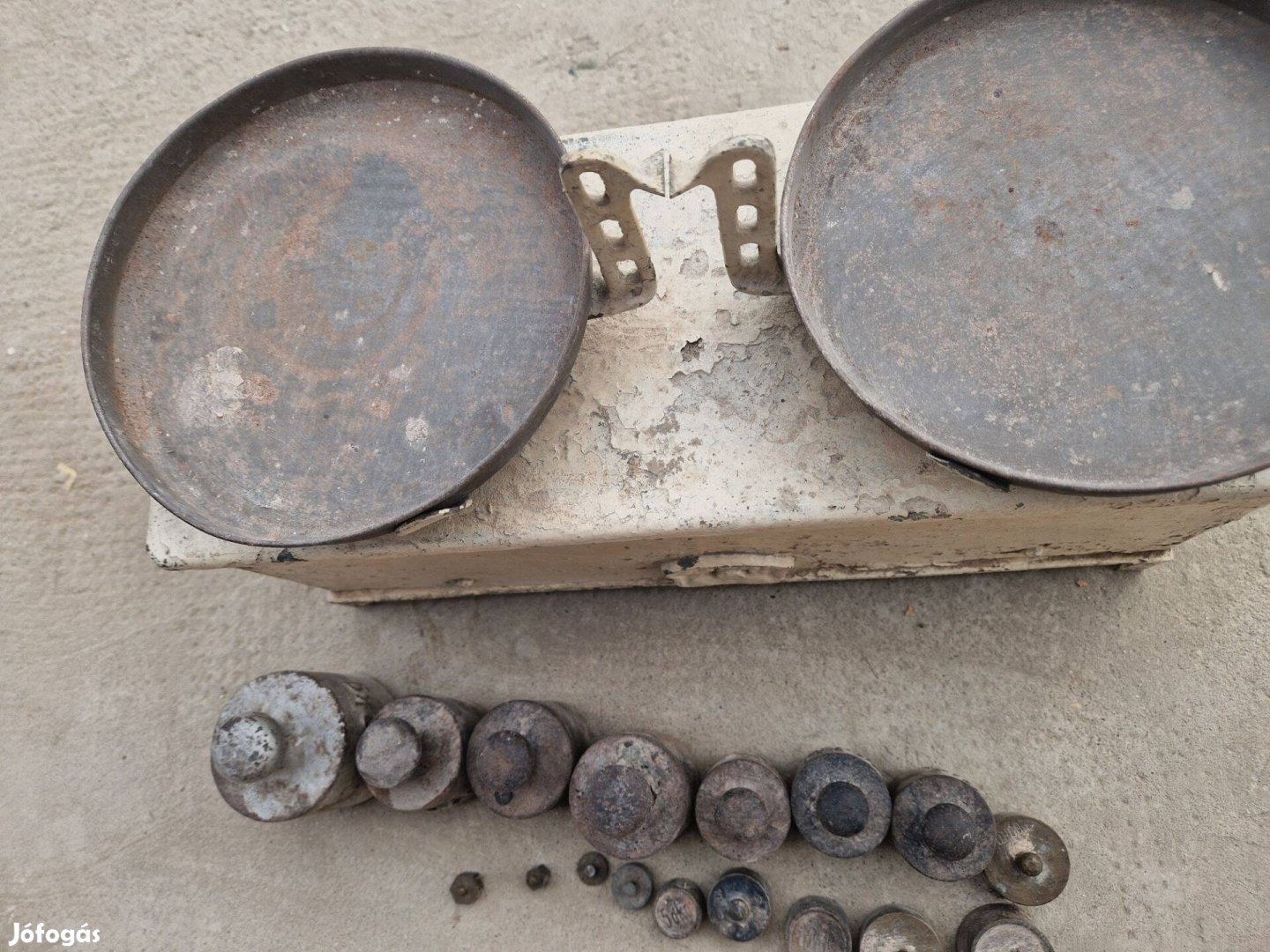 Antik öntöttvas asztali mérleg hiánytalan súlykészlettel (1920-30-as