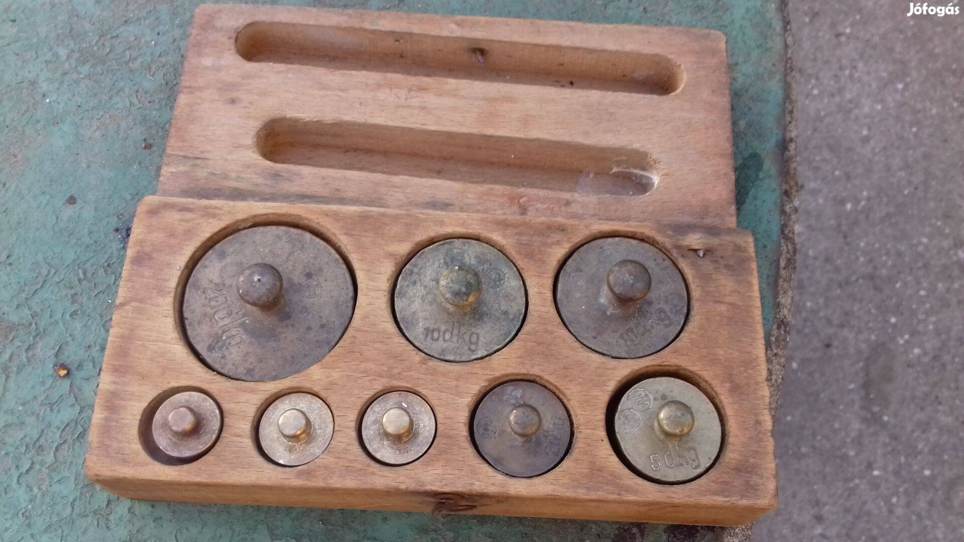 Antik réz súlykészlet eredeti fa dobozába