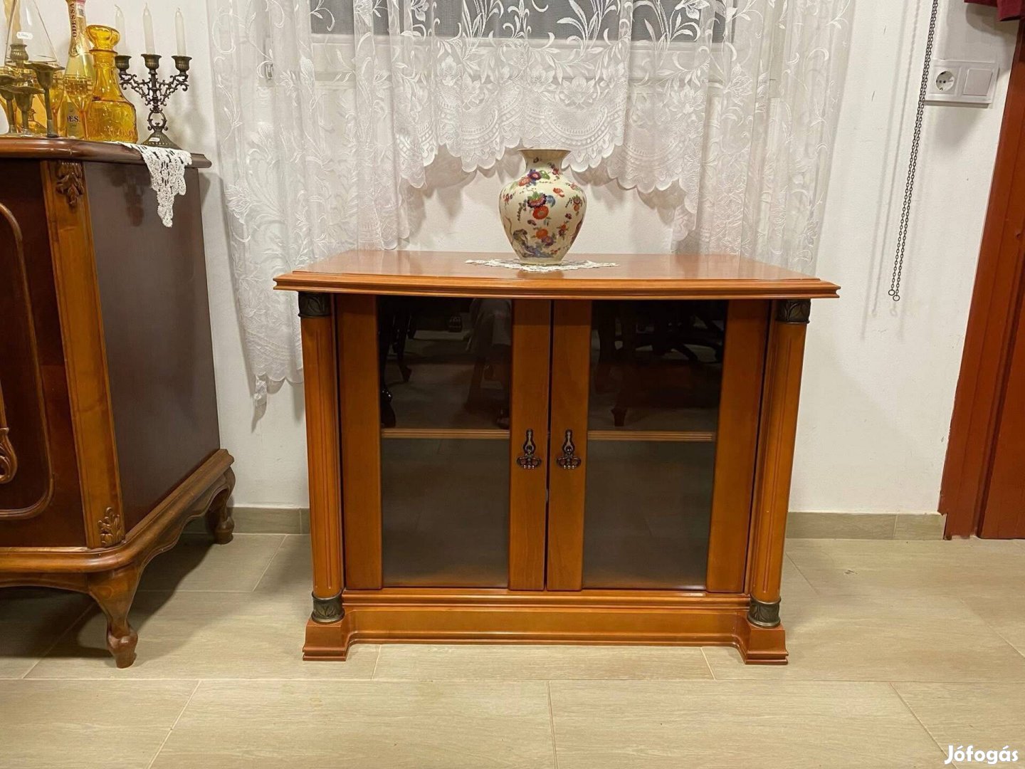 Szép állapotú 2 üvegajtós médiaszekrény magassága 70 cm, szélessége 90 cm, mélysége 55 cm.