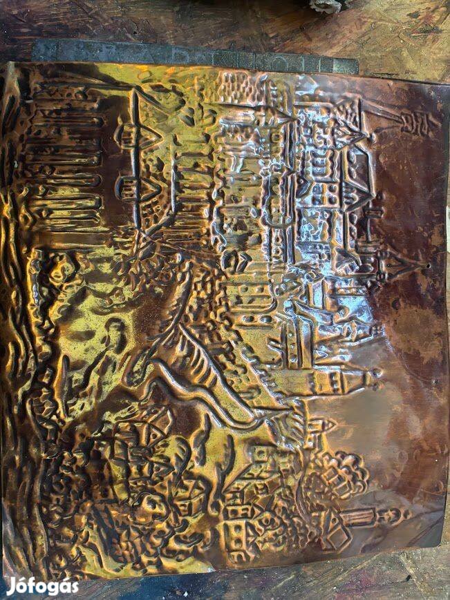 Eladó egy gyönyörűen kidolgozott, vörösréz lemezből készült dombornyomott falikép. A kép egy hangulatos középkori óvárost ábrázol templomtornyokkal és polgárházakkal. Igazi kézműves munka, amely a fényviszonyoktól függően más-más arcát mutatja a réz csillogásának köszönhetően.