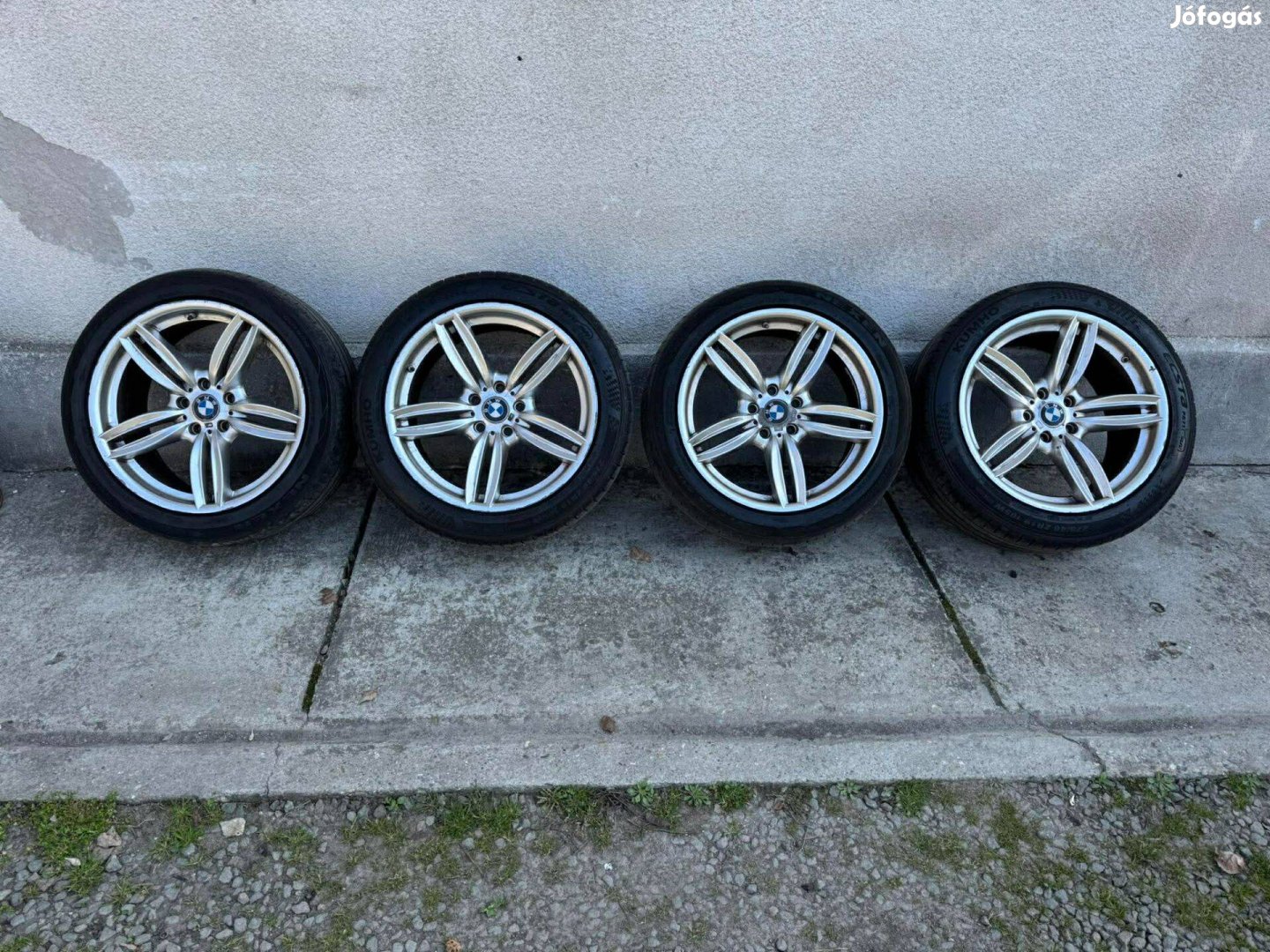 BMW 19" kétszéles alufelni, szerkezetileg hibátlan, jó minőségű, de nem gyári BMW, 2024-es nyári gumikkal (elől 245/45R19, hátul 275/40R19 széles), gyári F10 LCI nyomásszenzorokkal.