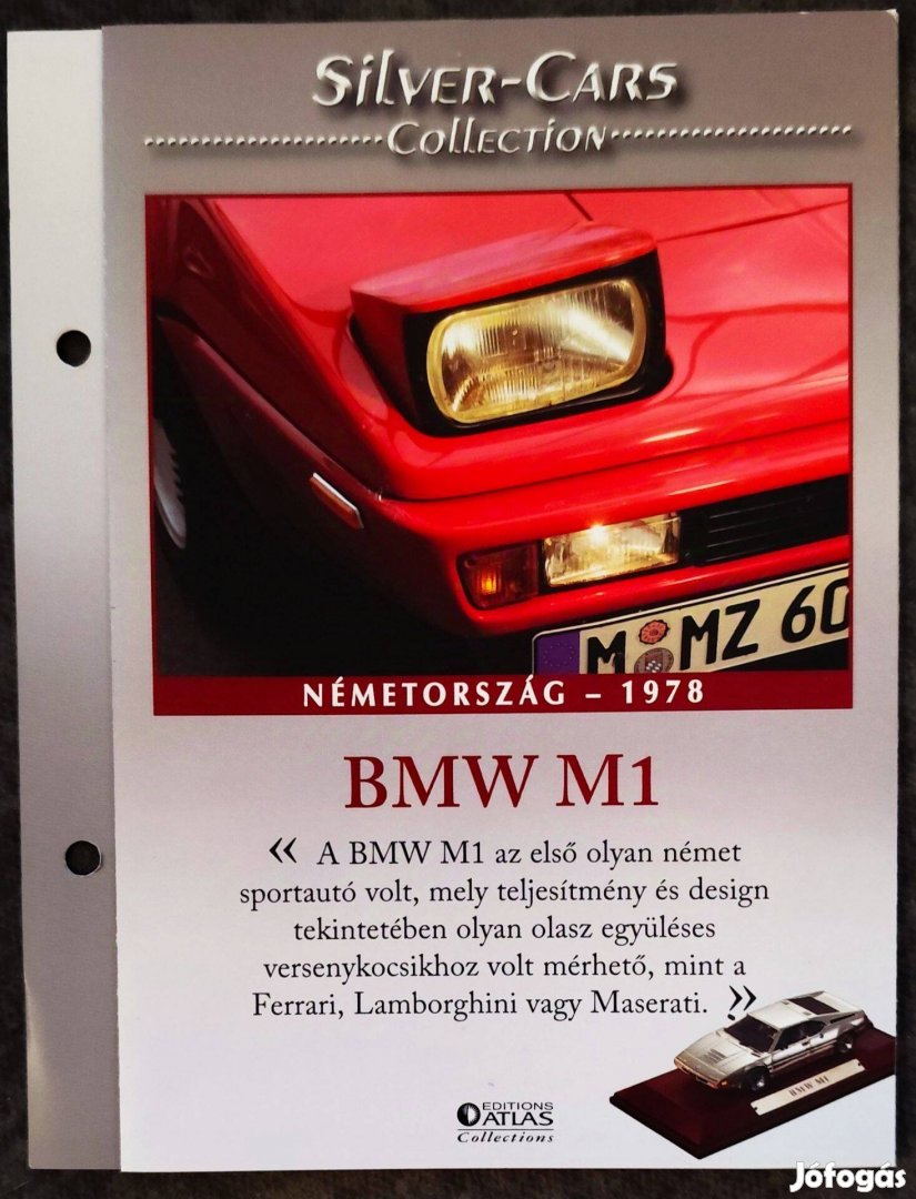 Eladó képeken látható és állapotú ATLAS Silver Cars Collection egyik darabja, 1:43 méretarányban: BMW M1. A modell sérült: motorháztető bal elején, hiányok: 2db visszapillantó tükör. A termékkel kapott certifikációt már csak 1 vevőnek tudom küldeni, mivel a többinek nyoma veszett a többieknek emailben fotó formájában tudom elküldeni a vásárláskor. Mivel ezek nem a kocsik nevére szólnak, így sablon szöveggel, mindegyikhez passzolnak. Papír doboza és a fekete tisztítókendő nincs meg; a fa alaplapra csavarozva, átlátszó műanyag doboztetővel küldöm.