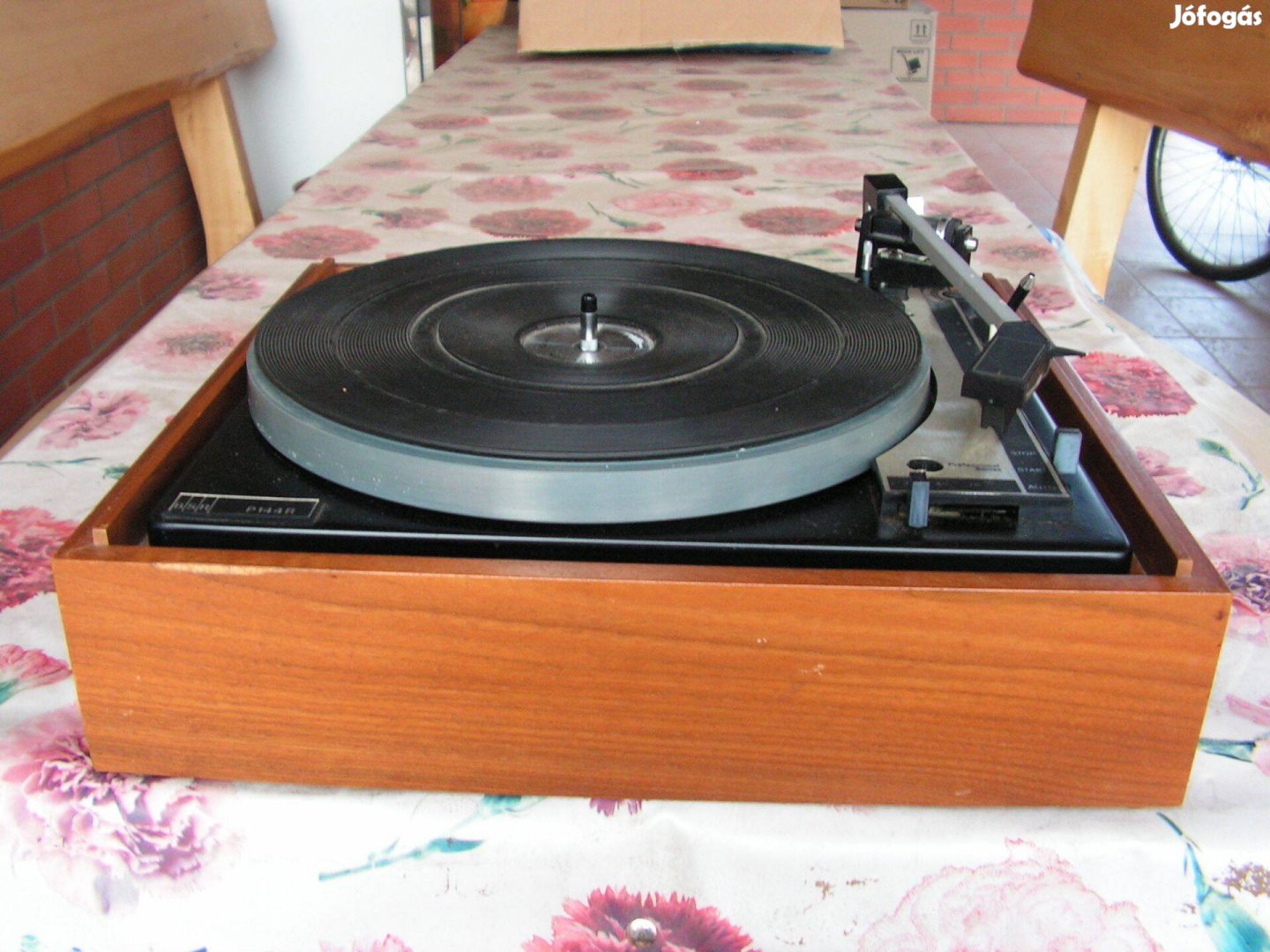 Gyűjteményemből eladó a fotókon látható BSR P144R angol félautomata bakelit lemezjátszó. Korát meghazudtoló nagyon megvigyázott funkcionális és esztétikai állapot. Szinte hibátlan fa káva ház, benne rugók felfüggesztésével a lemezjátszó sasszé. Dörzskerék meghajtás, a kerék gumija szimte új. Félautomata, kézzel kell elindítani, de a lemez lejárta végén a kart felemeli, vissza teszi a helyére és a motort ki is kapcsolja. Eredeti hangszedőjével de tű nélkül adom. Nem tudom, hogy valaha volt-e vagy egyáltalán van-e borító plexi teteje, de nálam sajnos nincsen.
