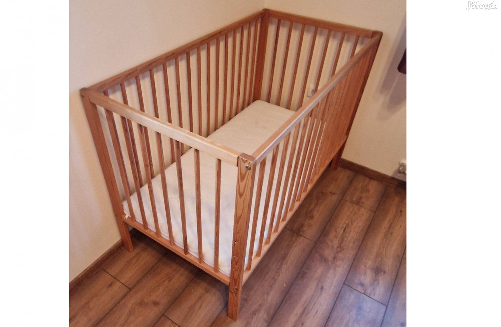 Eladó fenyő rácsos babaágy, állítható kivitelben, ajándék kókuszmatraccal.