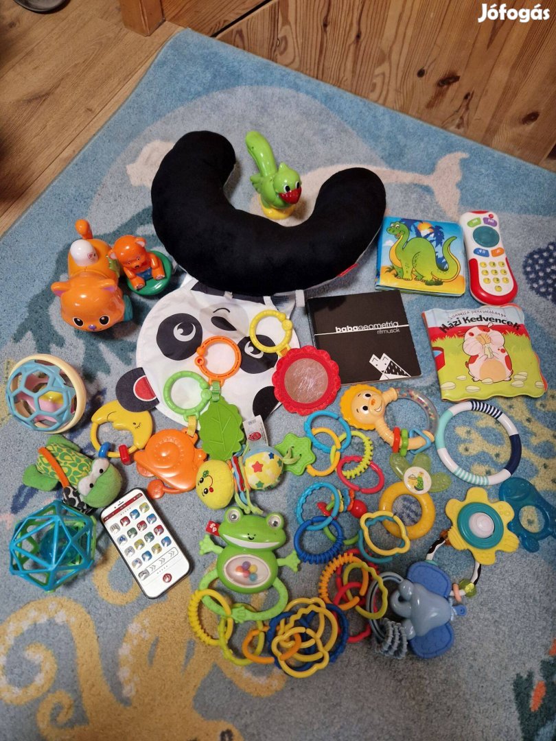 Csörgők, rágókák, Fisher Price pocakpárna, Babageometria, pancsolós könyvek, Keljfel Jancsi, gurulós cica, távirányító.