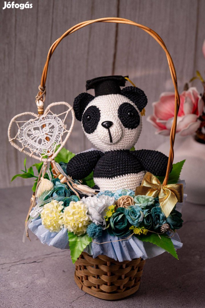 A panda fém betűzővel van rögzítve hátul 2 darabbal, kivehetőek. A panda magassága: 22 cm. Selyemvirágokkal díszítve.