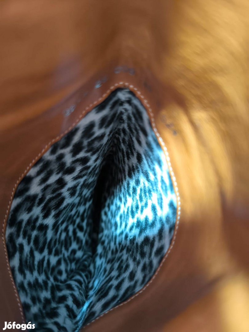 Barna, (tevebarna) színű spanyol bőr, magasszárú divat csizma, elegáns formatervezés, belül vékony párduc mintás béléssel (enyhe) télre, vagy átmeneti időre. Lapos talpú. (A bőr sorszámozott.)