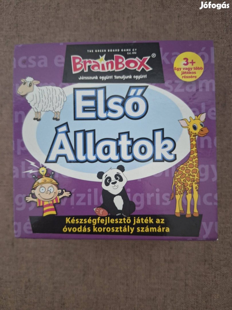 Hiánytalan,jó állapotú,magyar nyelvű . 3 éves kortól.A Brainbox Első állatok segít az óvodásoknak megismerni az állatokat. A gyerekek kártyákat húznak, melyek képes oldalán állatok vannak. Miközben beszélgetünk a kártyán lévő három képről, alaposan jegyezzünk meg mindent, mert amikor lefordítjuk a kártyát, emlékezni kell, mik voltak a képeken és azok milyen színűek voltak? Aki a kártya hátoldalán lévő kérdésre helyesen válaszol, megtarthatja azt. Ki tudja a legtöbb kártyát begyűjteni 5 vagy 10 perc alatt? Az lesz a győztes!