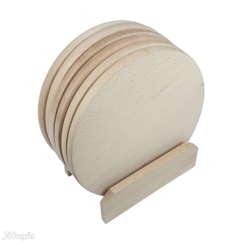 7 részes reggeliző készlet, 6 darab bükkfa vágódeszkával és egy bükkfa vágódeszka tartó, Kerek vágódeszka, méretei: kb 22 cm átmérő, 15 mm vastagság.
