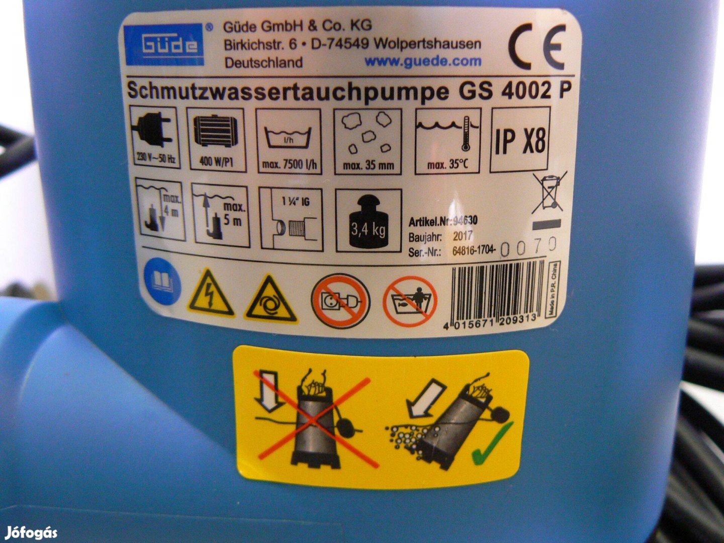 Szennyvíz szivattyúzására is alkalmas, 400W-os motorteljesítménnyel, 5méteres max. emelési magassággal, úszókapcsolóval.