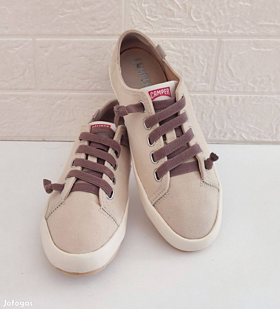 Pár alkalommal viselt, nagyon szép állapotú, bézs színvilágú Camper Peu női cipő sportos, belebújós fazonnal, gumis fűzővel, rázkódáscsillapító gumitalppal, párnázott talpbéléssel.