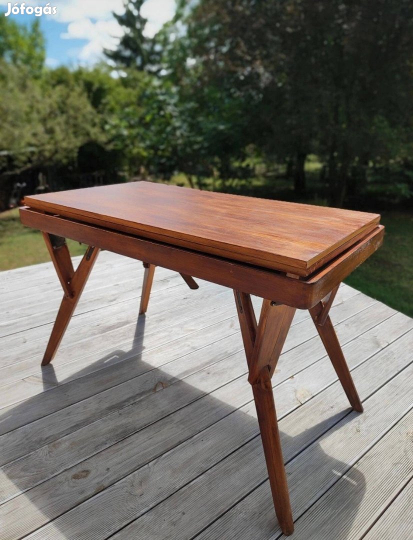 Étkező asztal ami dohányzó asztallá variálható egy az asztal alá rejtett kar segítségével .Erdekes mechanikai megoldás.Vendeglapos az asztal 8 személyre is kinyitható.Használat nyomai és a kor meglátszik rajta de mindene eredeti állapotában van.