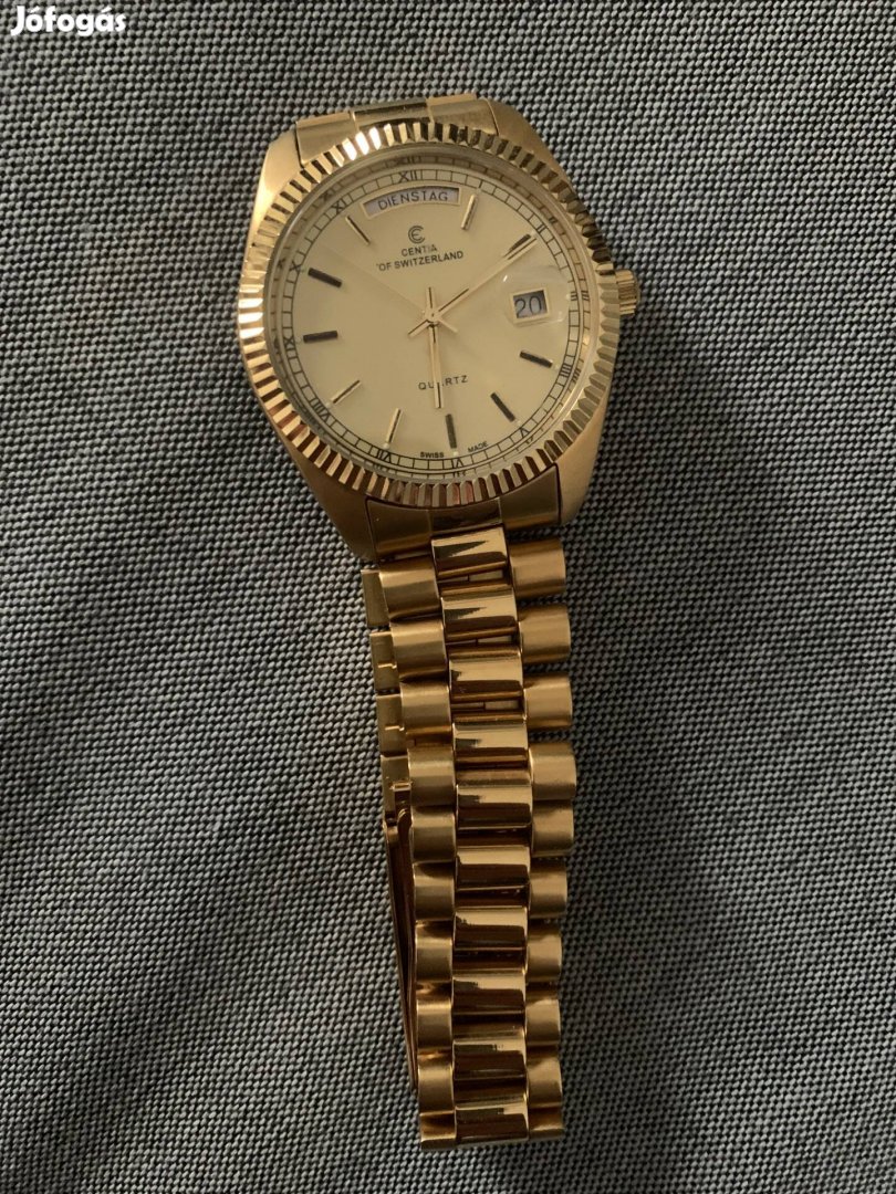 Eladó egy elegáns, vintage stílusú Centia of Switzerland férfi karóra. Az óra svájci gyártmányú, megbízható kvarc szerkezettel, ikonikus aranyozott külsővel és Day-Date (nap/dátum) funkcióval rendelkezik.