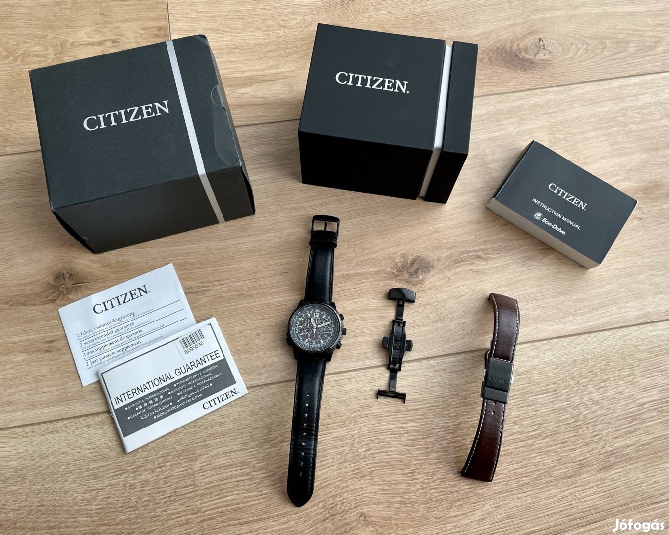 A gyári, barna békazáras szíjon kívül jár még hozzá egy fekete, mágnescsatos szilikon szíj (erről tudok küldeni videót), valamint fekete, pillangózáras bőrszíj is.