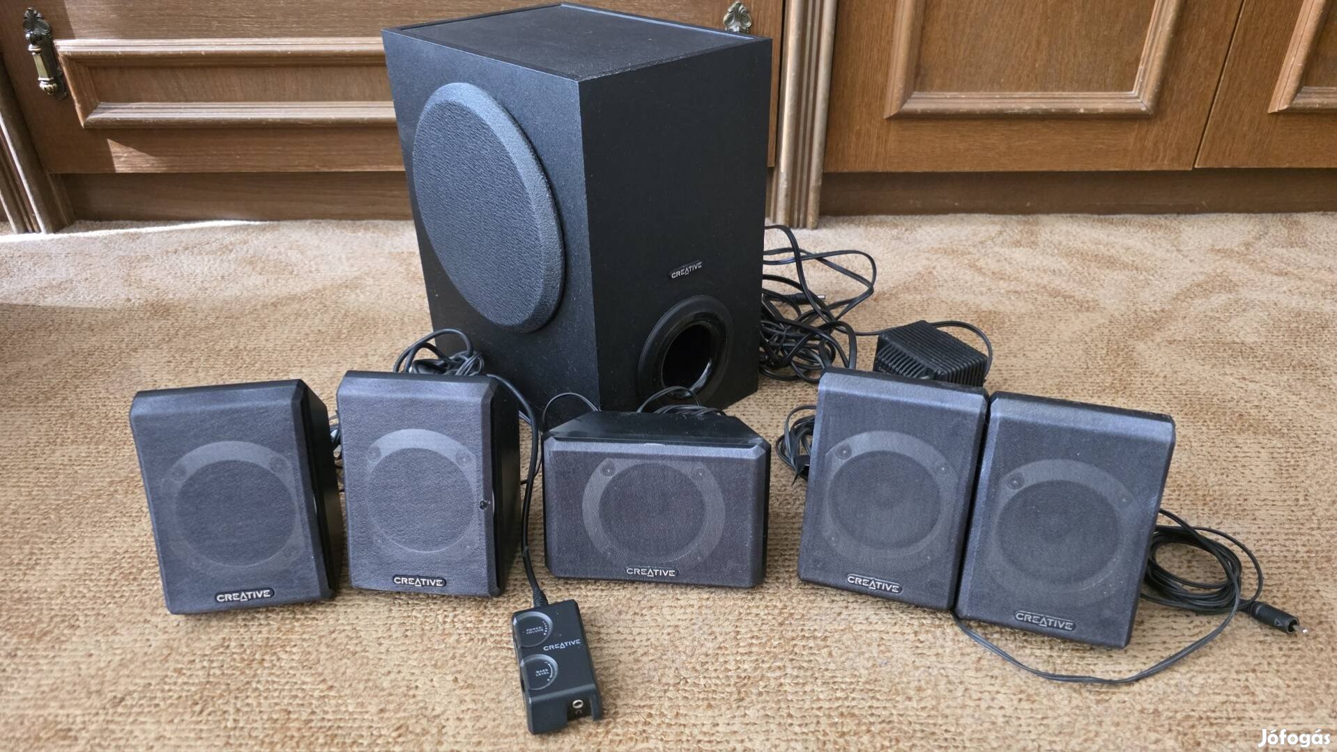 Eladó a képen látható állapotban lévő Creative Inspire 5.1es hangfalszett, működő állapotban, az egyik hangszoro sarkan a boritas 5mm sérult de ez csak esztetikai hiba.
