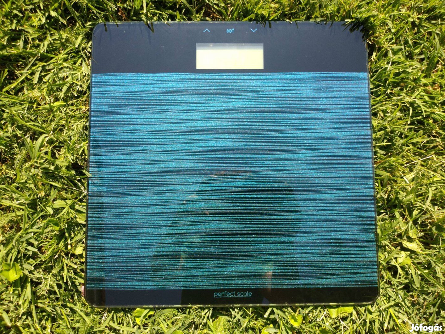 Csillámos zöld színű, egyedi dizájnú, különleges kivitelű digitális kijelzésű fürdőszobai okosmérleg súlyoptimalizációs visszajelzéssel 3 féle háttérvilágítással eladó, csillámos felülettel, türkizzöld/türkizkék színben. A mérleg üveglap mérőfelülettel rendelkezik, alatta exkluzív egyedi csillámos fényezéssel. 3 féle háttérvilágítással rendelkezik, mivel beállítható az optimális testsúly és ha a mért súlyunk alatta van, kék háttérvilágítás jelenik meg a mért súly mögött, ha a súlyunk több, piros háttérvilágítás jelenik meg a mért súly mögött. Ha a mért súlyunk az elmentett súllyal megegyezik, akkor a háttérvilágítás zöld.
