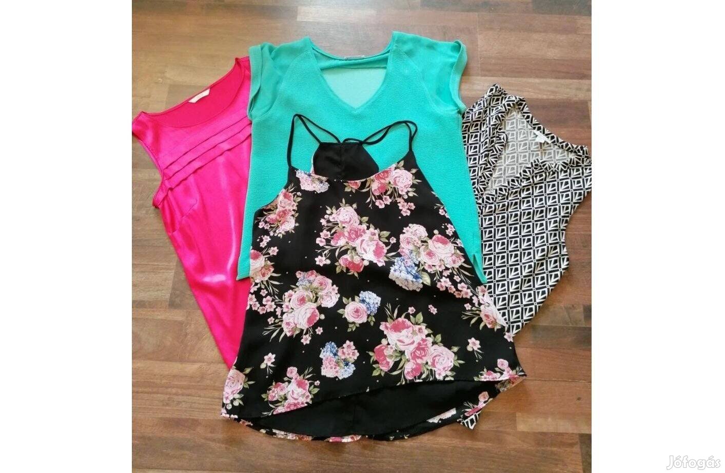 Megkímélt állapotú, hibátlan felsők különböző márkával. A fekete virágos kétrétegű selymes anyagú, a zöld a vállrészen áttetsző, a pink szaténból van a fekete-fehér puha viselet.