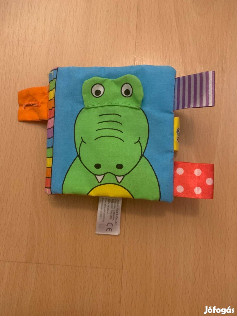 Csörgő, zörgő, zizegő textil könyv, első könyv, állatok, címke