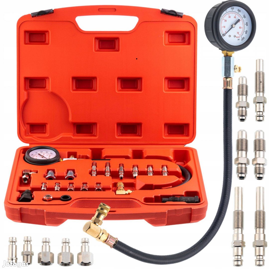 A sokoldalú szett 20 különböző adapterrel rendelkezik, így a legtöbb dízelmotorhoz könnyedén csatlakoztatható. A nagyméretű, jól leolvasható manométer 070 bar (01000 PSI) tartományban mér, így megbízható és pontos eredményt biztosít.