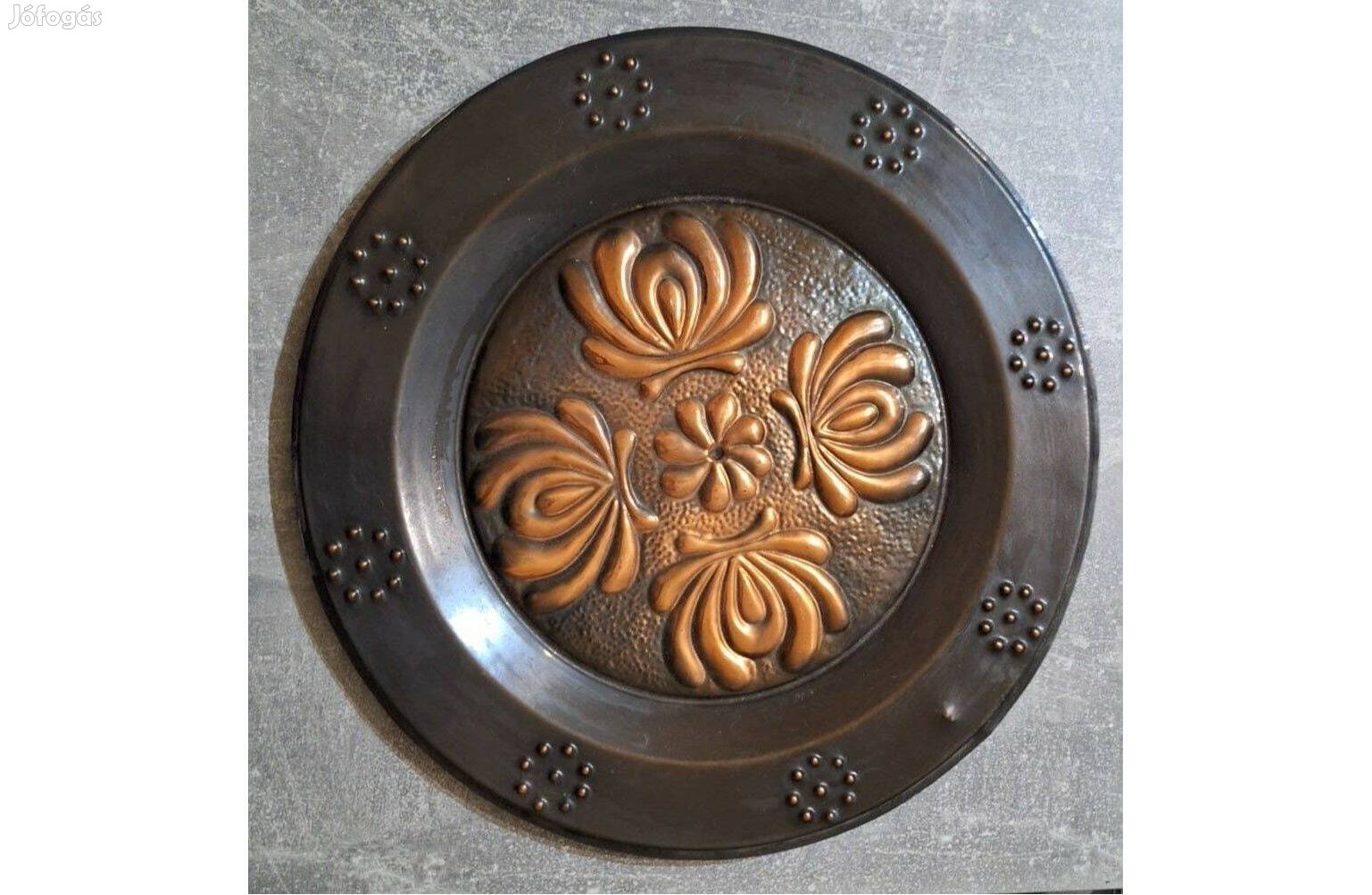 Átmérője 28,5cm.Szép állapotú dombornyomott réztányér.