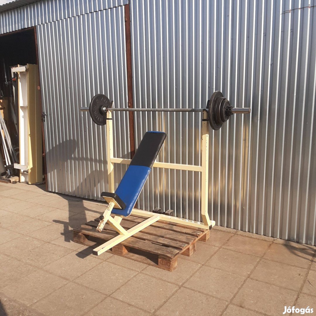 Edzőtermi 45 fokos fekpad állítható ülés villák, 20kg rúd , 2x15kg, 2x10kg. 2x5kg, 2x2,5kg gumis és fém súlytárcsa, gyors szorítókkal.