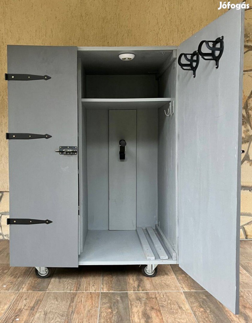Egyedileg gyártott, tartós használatra tervezett nyeregszekrény. A pakolhatóságot 5 polc, egy fiók és számos akasztó biztosítja, melyek átlátásáról - a sötét téli délutánokra gondolva - a belső ledes világítás gondoskodik. A mozgatását 125 mm-es önbeálló görgők segítik.