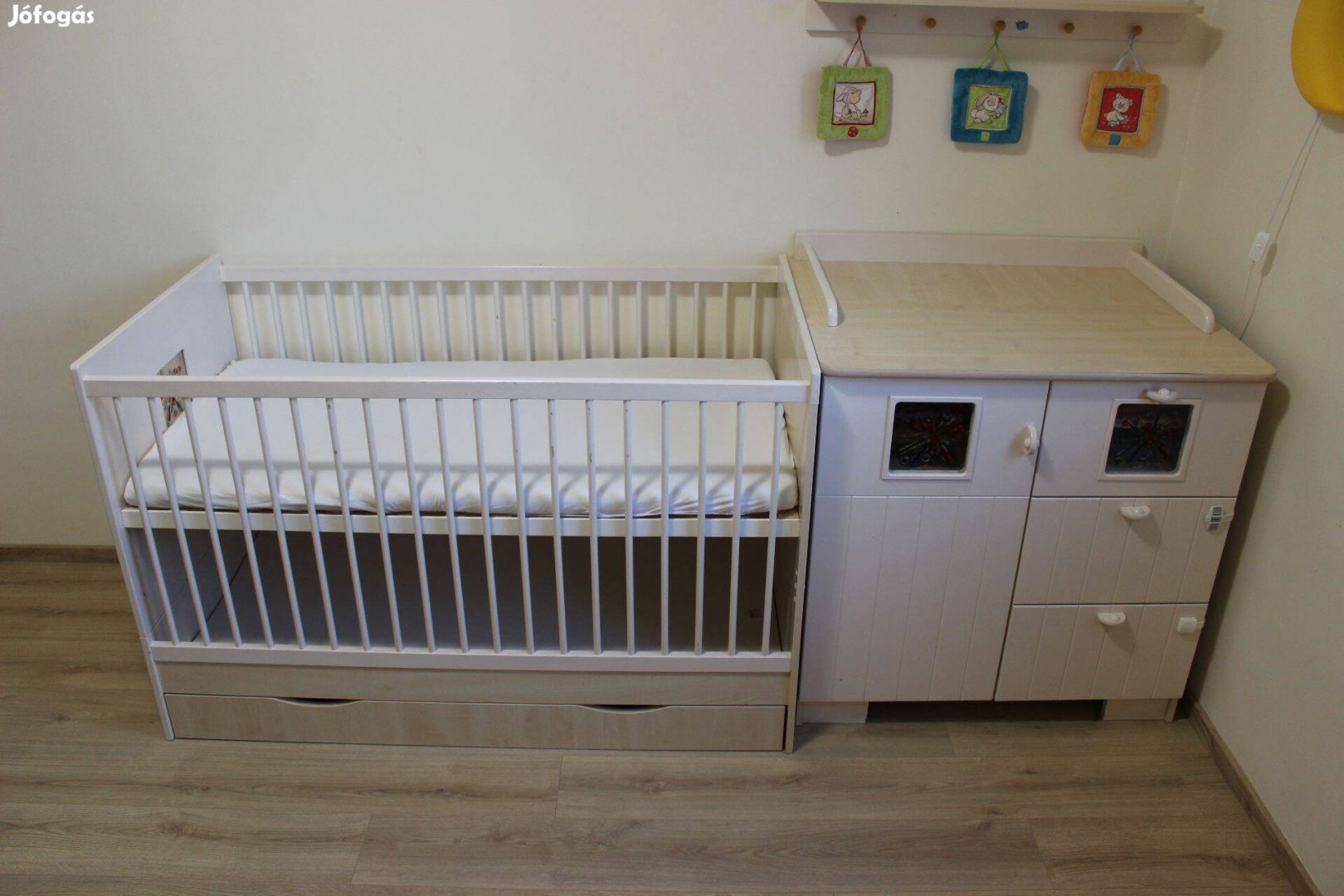 A 140x70 cm-es kiságy rácsos részén használatból eredő kisebb felületi sérülések találhatóak.