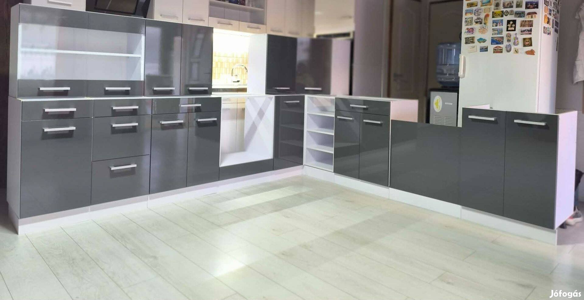 Eladó Új bemutatódarab 3x2,8m fehér konyhabútor fényes szürke fronttal
