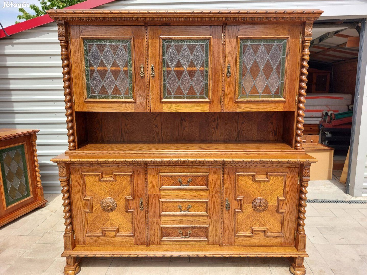 Eladó egy Nagy Méretű ,3 fiókos, polcos, vitrines Liverpool Koloniál tálaló szekrény.