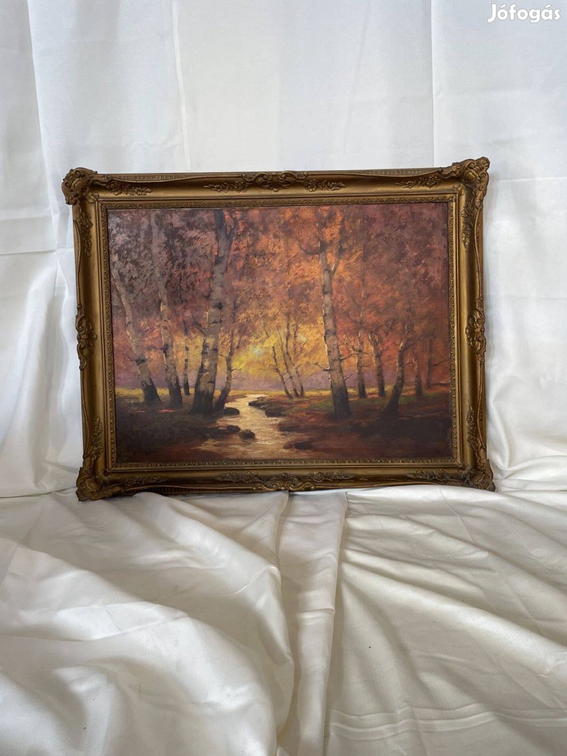 Eladó a címben említett őszi naplemente tematikájú festmény, gyönyörű keretben.