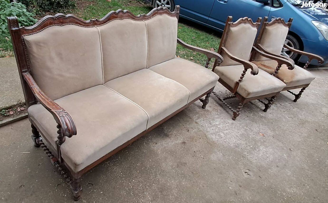 Eladó egy stílbútor garnitúra. Kellemes otthonos hangulata van. Egy nagy kanapé, 2 fotel, 2 szék és egy dohányzó asztal. Korának megfelelő a képen látható jó állapotban. Kis hibával, az egyik fotel foltos kicsit. irányár 150.000 ft.