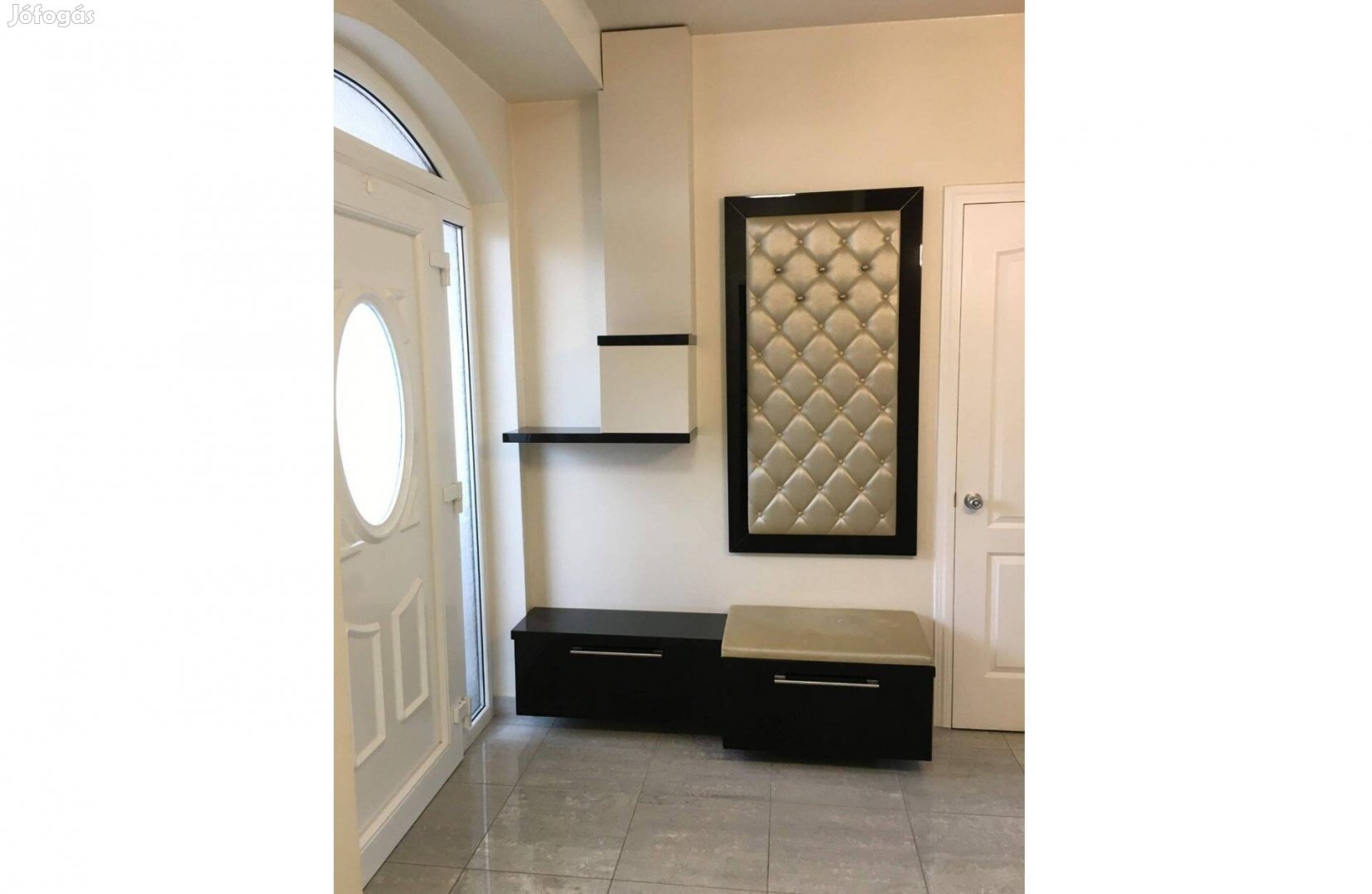 Eladó a képen látható elegáns fogas, 5 fogantyúval (3 a felső soron és 2 alatta). Lakk, fekete szegélyen van a steppelt arany színű műbőr. Nagyon elegáns előszobabútor. A fogas mérete 140cm x 75cm x 5cm