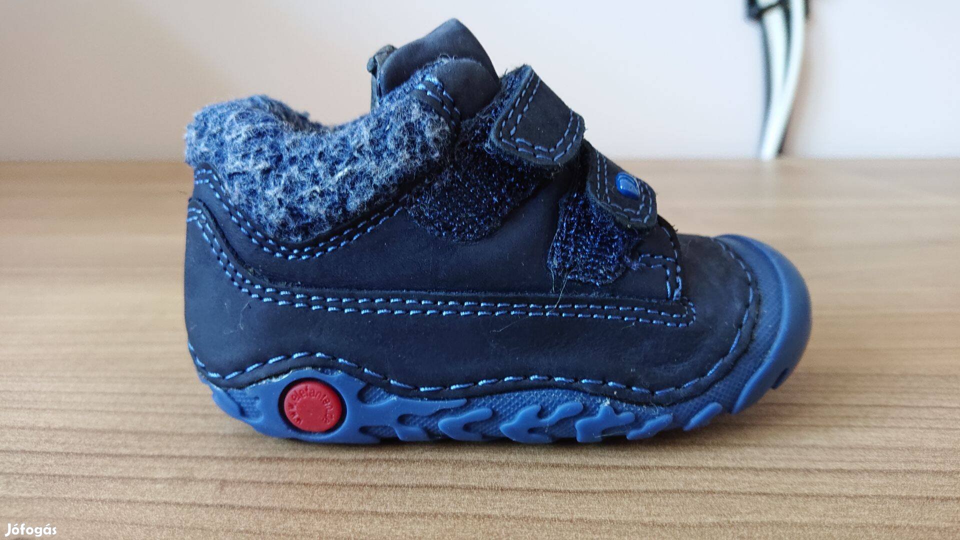 19-es, bőr, sötétkék, bélelt, fiú félcipő eladó, egy őszi/tavaszi szezonban volt használva, alig van rajta kopás. Puha, csúszásgátlós talpa van, közepes lábfej szélességre ideális, 2 tépőzáras.