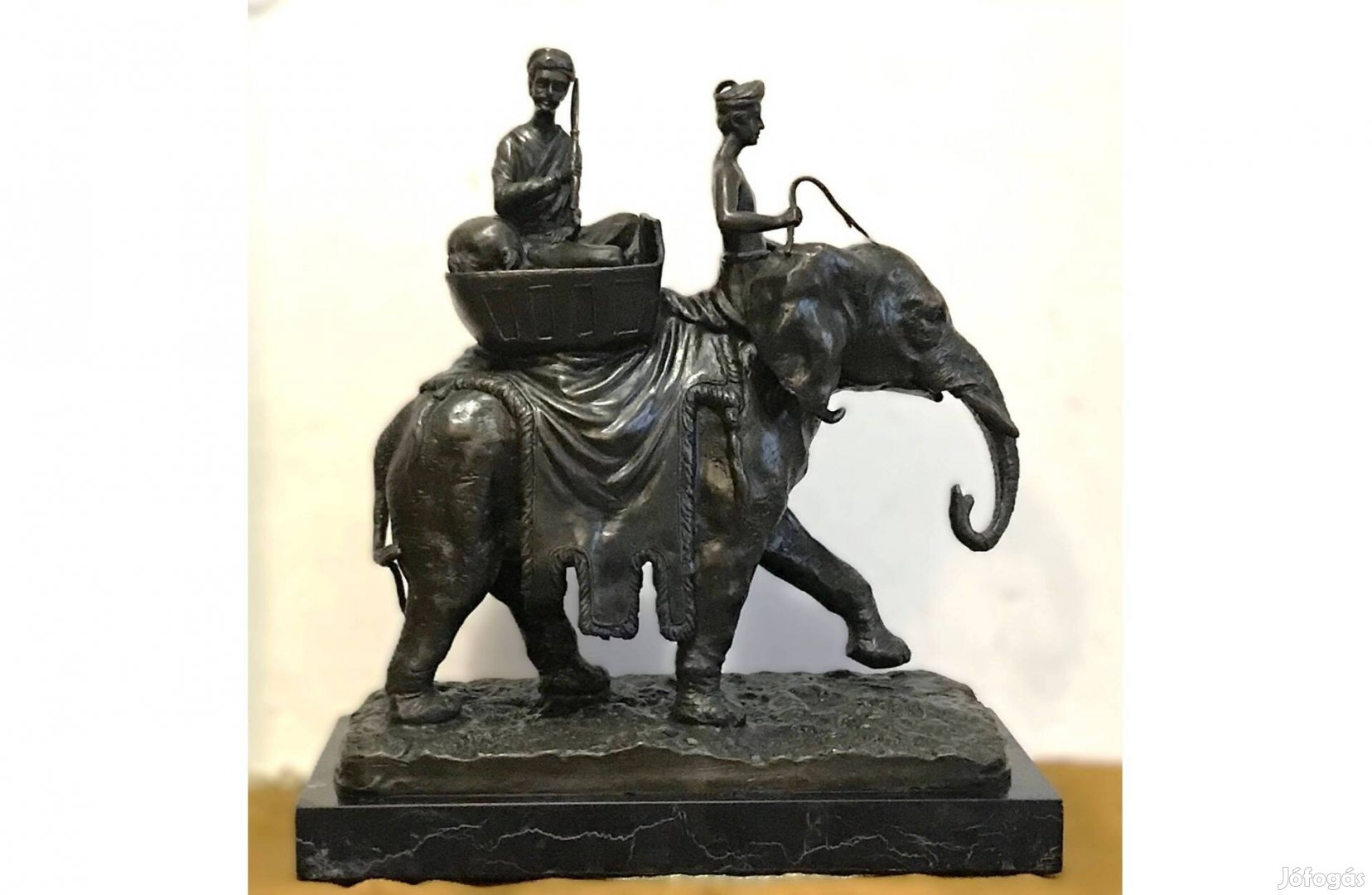 Antikolt bronz elefántos szobor "Fratin" jelzéssel, fekete márvány posztamensen, hibátlan. Magassága 33 cm, szélessége 30 cm, mélysége 16 cm, súlya 9,4 kg posztamenssel együtt.