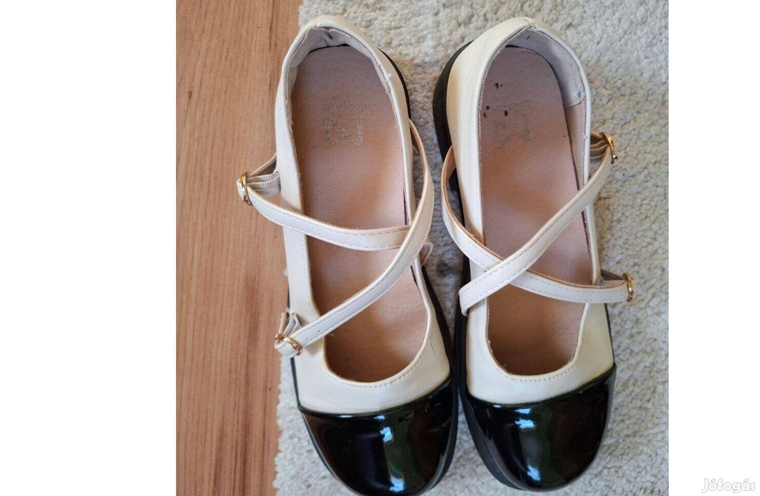 Elegáns, keresztben duplapántos, fekete-fehér lakkcipő, lapos sarokkal.