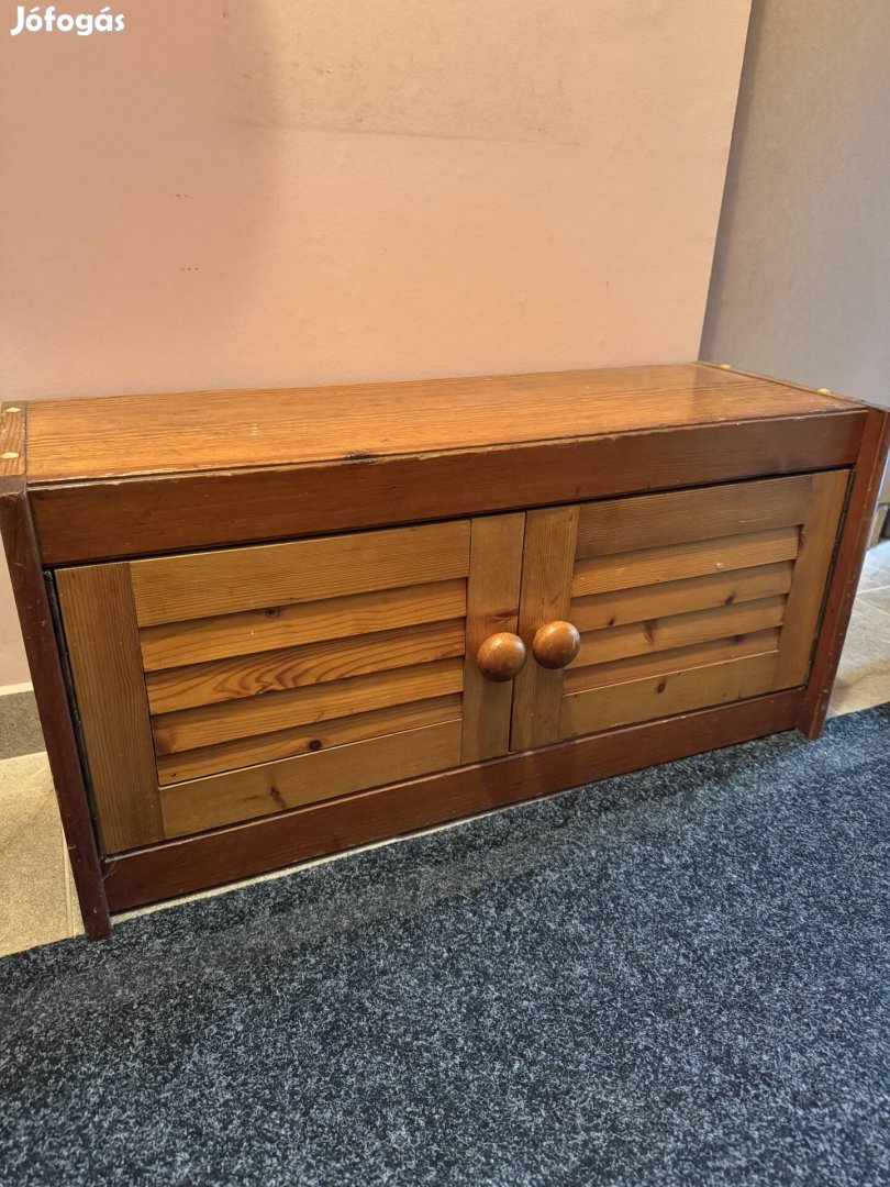 Eladó a képeken látható előszoba fa cipős szekrény/ ülőpad. Anyaga: Tömör fa. Ajtaja tökéletesen nyitódik-záródik. Szerkezetileg egyben van, masszív.