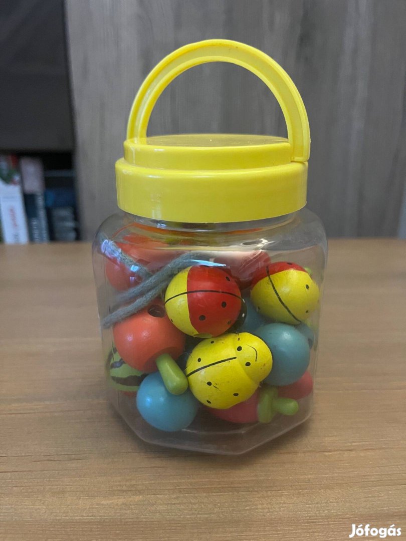 Fakopáncs, fűzős játék, fa gyümölcsök és katicabogár