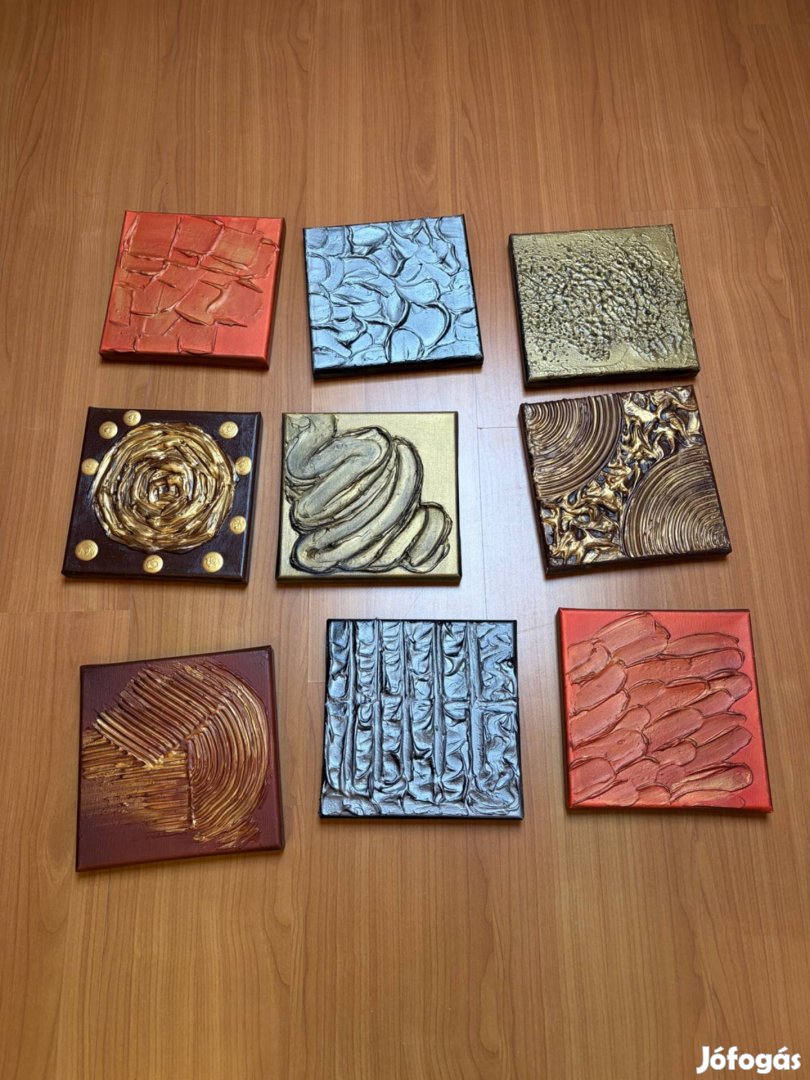 Kézműves, dombormintás kép-szett. A kis négyzet alakú képek 20x20cm-esek. Bárhogy variálhatóak együtt és külön-külön is. Nagyon szép fényes felületük van. Arany, ezüst, barna, narancs színűek. Egyben eladó.