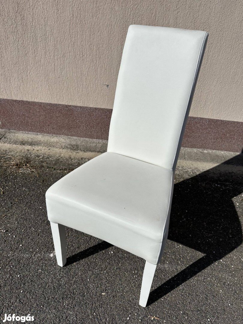 Fehér, műbőr kárpitos, fehérlábú szék, "Henriksdal" fantázianévvel. Használt, így a lábakon karcok lehetnek, a műbőr kárpit sérülés mentes. Magasság 104 cm, szélesség 45 cm, az ülőmagasság 46 cm, Támla magasság 58 cm, ülésszélesség 45 cm x 41 cm. Az ár darabonként értendő és van belőle 6 db. Személyes átvétellel elvihető.