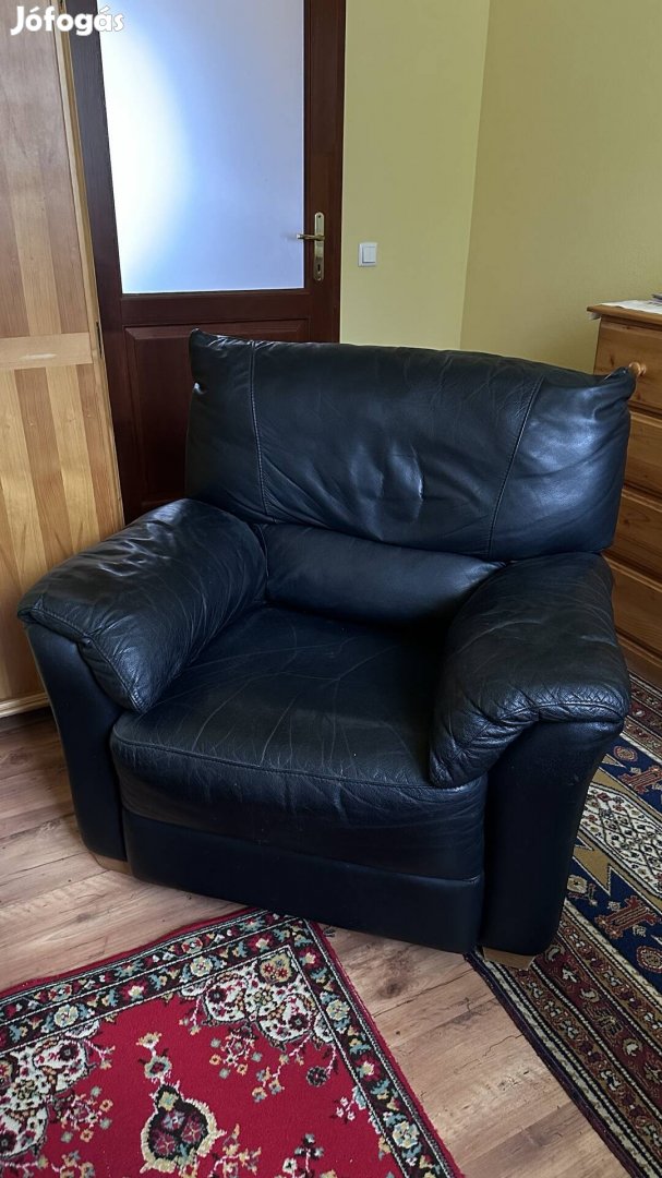 Fekete, valódi bőr fotel, széles, kényelmes darab, jó fogású bőr