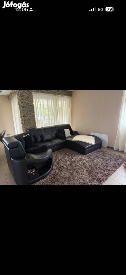 Hibátlan , fekete színű bír U-alakú kanapé.