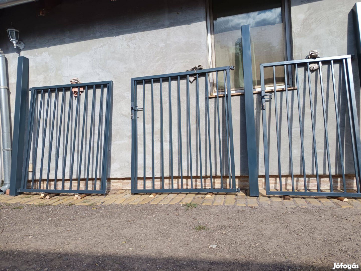 A kapuoszlopok 100×100×3 mm falvastagságú zártszelvényből készülnek, stabilan, legalább 6080 cm mély beton alapba süllyesztve. A szerkezethez tartozik egy nyelves kapuzár, amely kulccsal zárható, valamint 5,5 cm átmérőjű, nagy teherbírású kapupántok, amelyek három ponton rögzítve biztosítják a kapuszárnyak egyenletes, hosszú távon is megbízható működését.