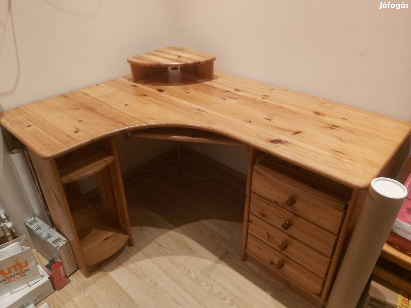 Használt, de szép állapotú fenyő sarokíróasztal. Összesenn74 centi magas, hosszabbik része 150 hosszú 60 széles, kisebbik 147 hosszú 58 széles.
