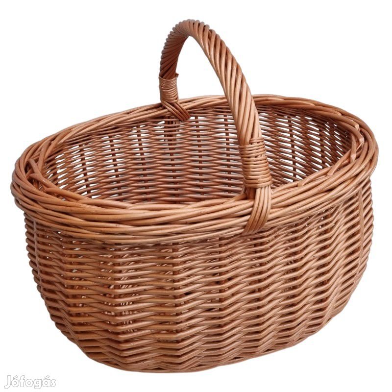 Vesszőből fonott füles bevásárló kosár lakkozva. Méretei: kb. 44 cm hosszú, 31 cm széles, 35 cm magas fül tetejénél mérve. Egyedi kézműves termék, ezért kérem, vegyék figyelembe, hogy a méret, a szín és a minta kis mértékben eltérhetnek!