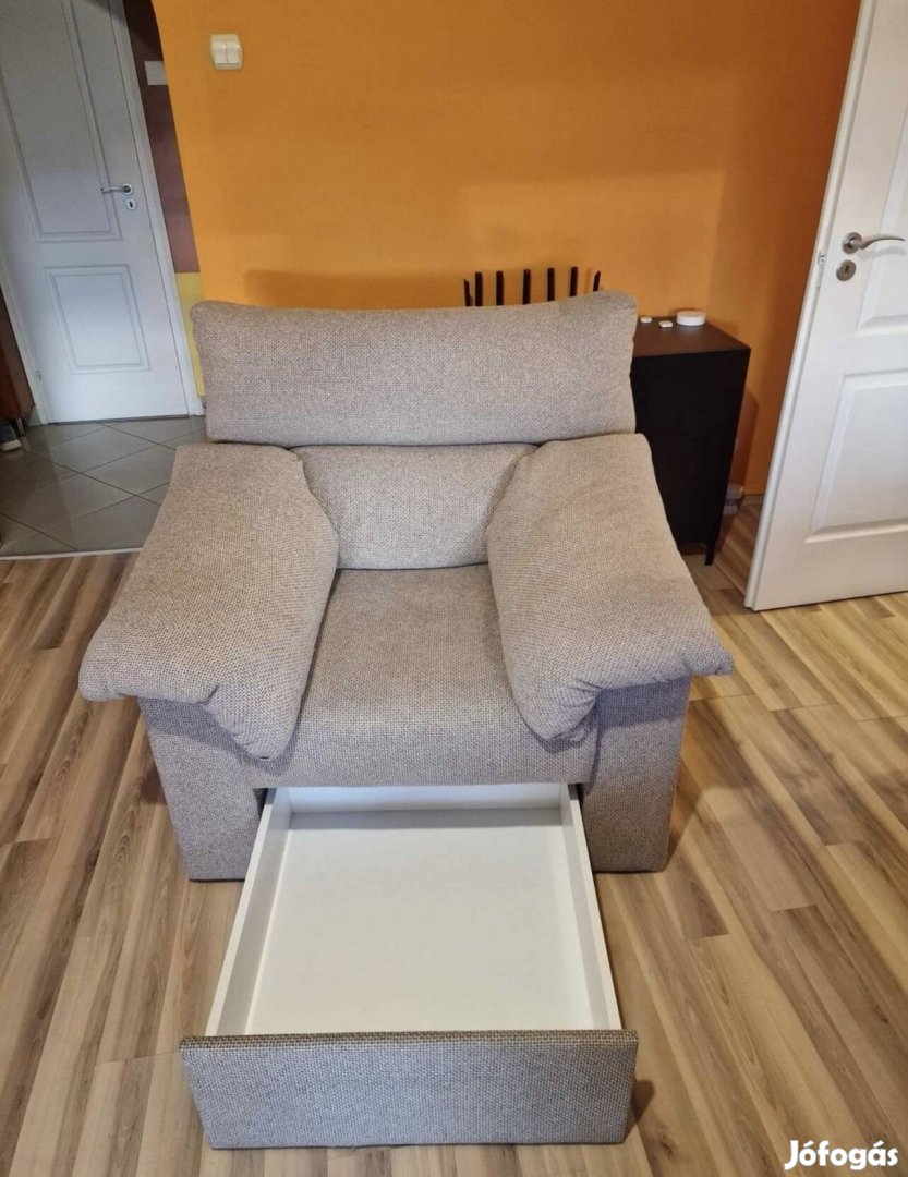 Erdélyben csináltatott, egyedi gyártású masszív hibátlan állapotú fotel. Strapabíró bézs huzattal ami a párnáiról levehető. Extra hogy a fejtámla része több pontban állítható, és kihúzható az alja így nagyon praktikus is!